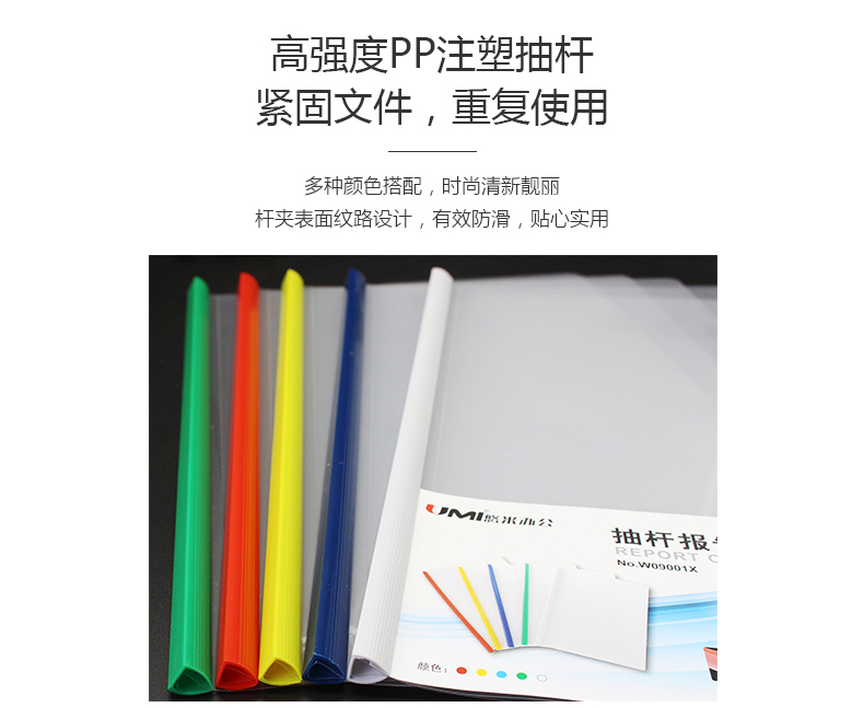 高强度PP注塑抽杆,紧固文件,重复使用。多种颜色搭配,时尚清新靓丽。高透板片,文件存放一目了然。杆夹表面纹路设计,有效防滑,贴心实用。
