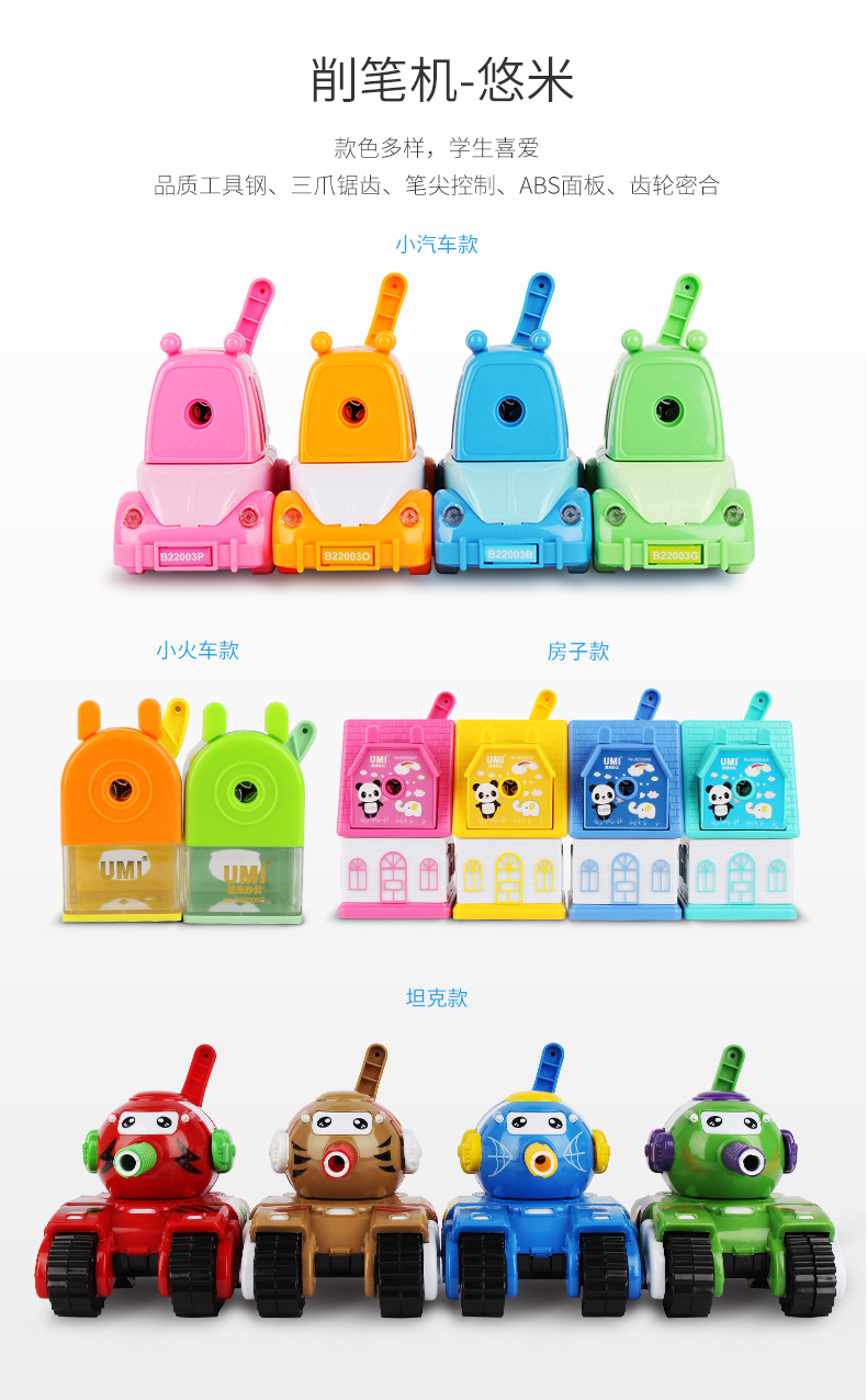 款式多样,学生喜爱。削笔更锋利,快速削笔省时间。手感舒适无毛刺,坚固耐用好品质。高精度齿轮,咬合准,摇臂更轻松。大容量笔屑盒,笔屑不外飘