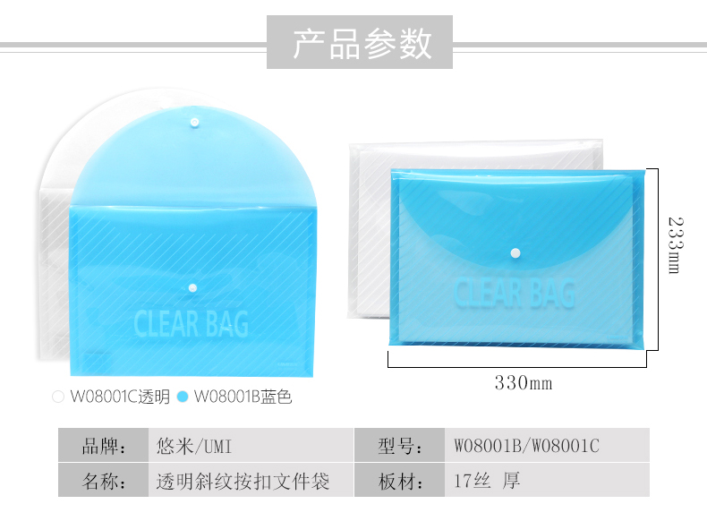 当前位置:首页 > 办公及体育用品用品-文件管理用品-文件夹(袋) > 悠米 透明斜纹按扣文件袋,A4 W08001C 透明 600个/大包