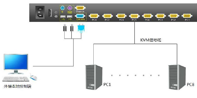 通过专用级联口可另外再串接31台Combo KVM,最多可控制256台主机