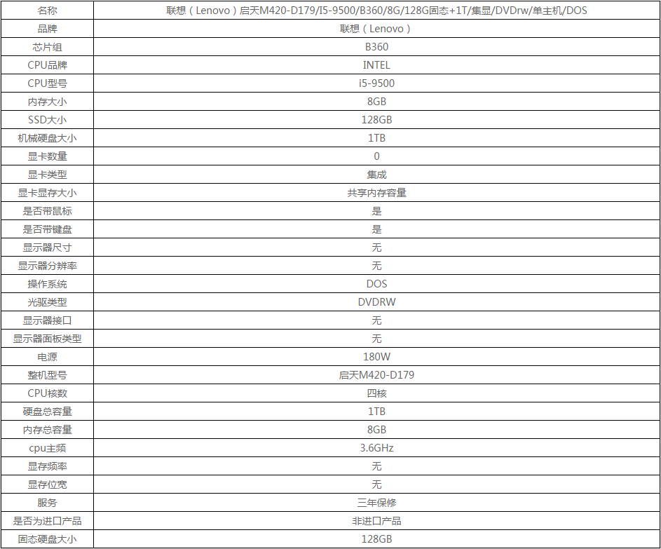 联想(Lenovo)启天M420-D179/I5-9500/B360/8G/128G固态+1T/集显/DVDrw/DOS/三年上门保修