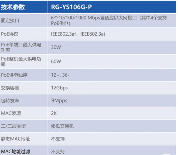 当前位置:首页 > 通用办公设备-网络设备-交换机 > 锐捷6口干兆PoE监控交换机RG-YS106G-P PoE功率60W 满载摄像头双上联接口企业园区安防监控交换